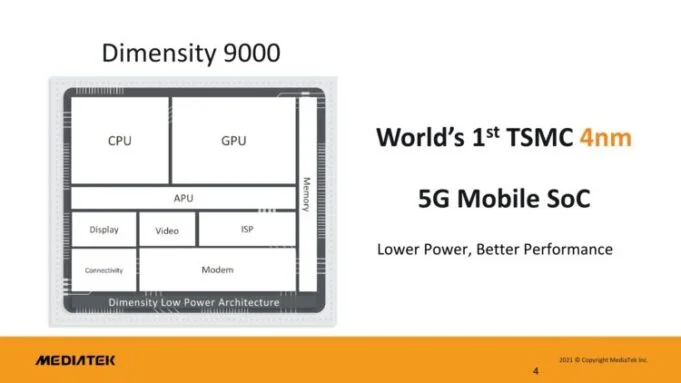 The MediaTek Dimensity 9000 is the first chipset built through a 4nm manufacturing process from TSMC based on the new ARM architecture, v9. The chipset contains one 3.05Ghz Cortex-X2 core, three 2.85GHz Cortex-A710 cores, four 1.8GHz Cortex-A510 high-efficiency cores, and 10 Mali-G710 GPU cores.